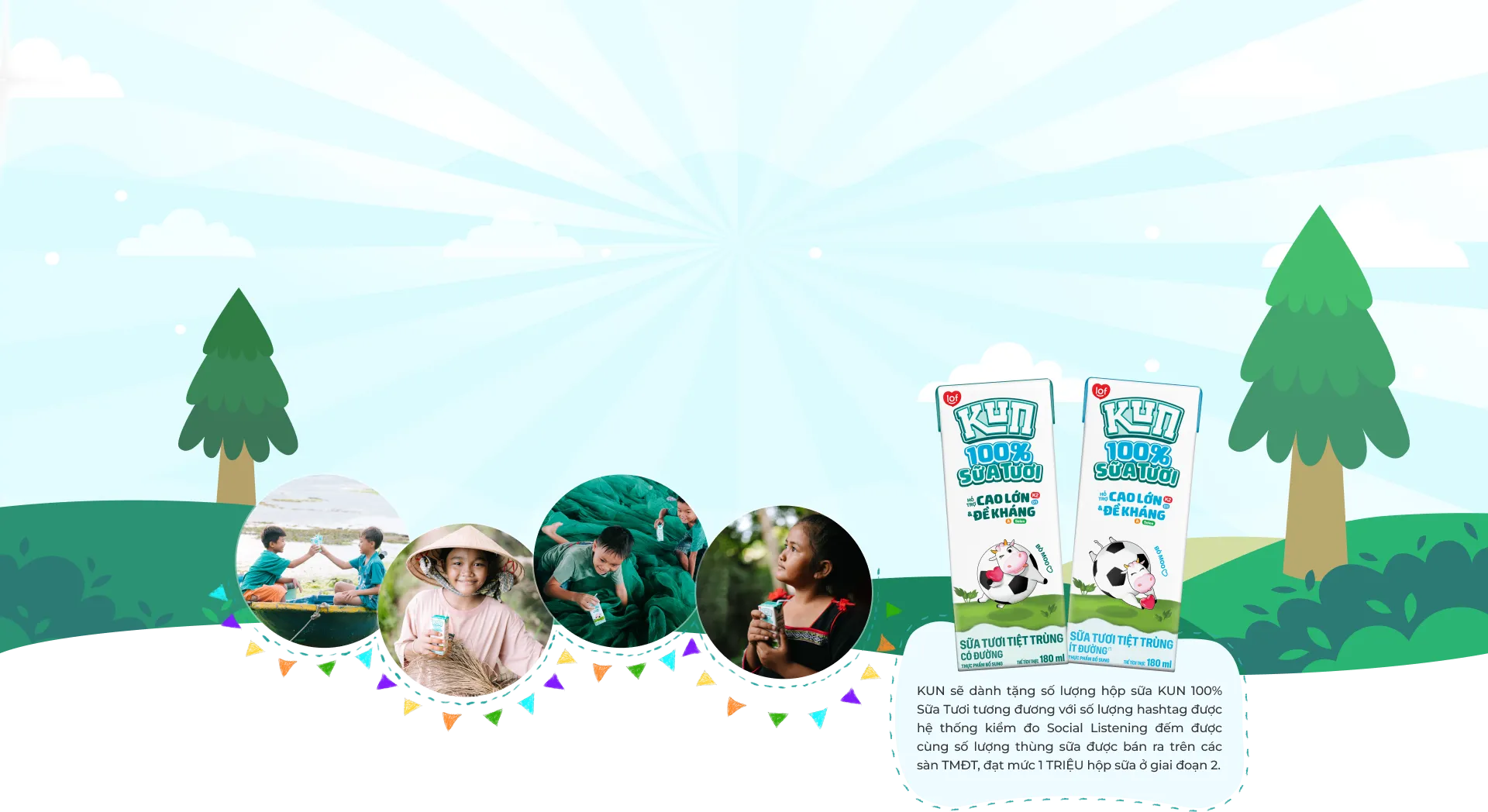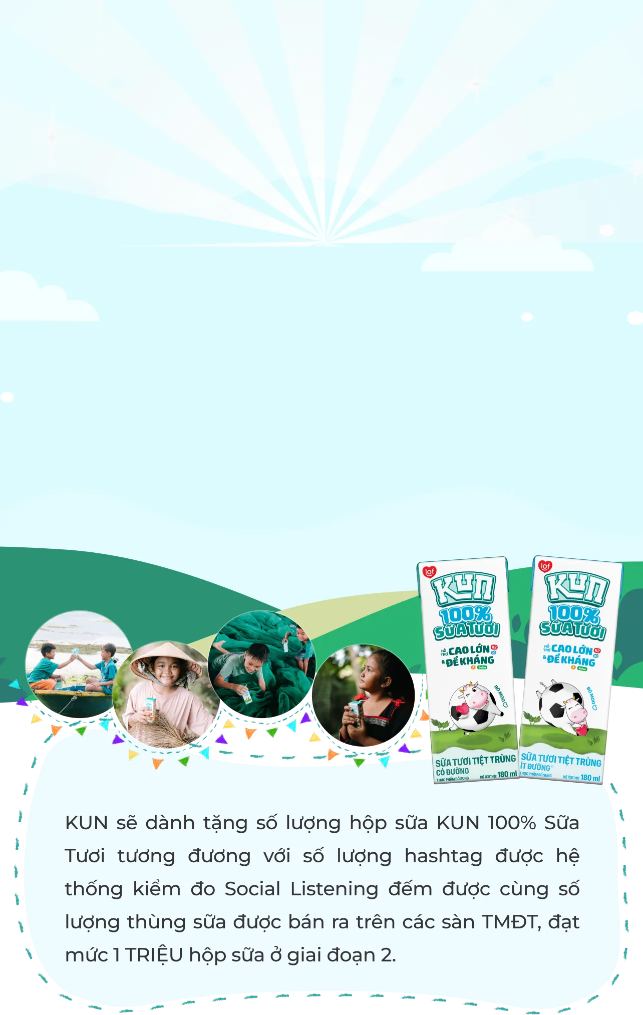 Mua 01 thùng KUN 100% Sữa Tươi trên Shopee/Lazada/ Tiktok Shop đồng nghĩa với việc bạn đã cùng KUN đóng góp 1 thùng KUN 100% Sữa Tươi cho các em bé ở vùng miền xa xôi khó khăn của tổ quốc.